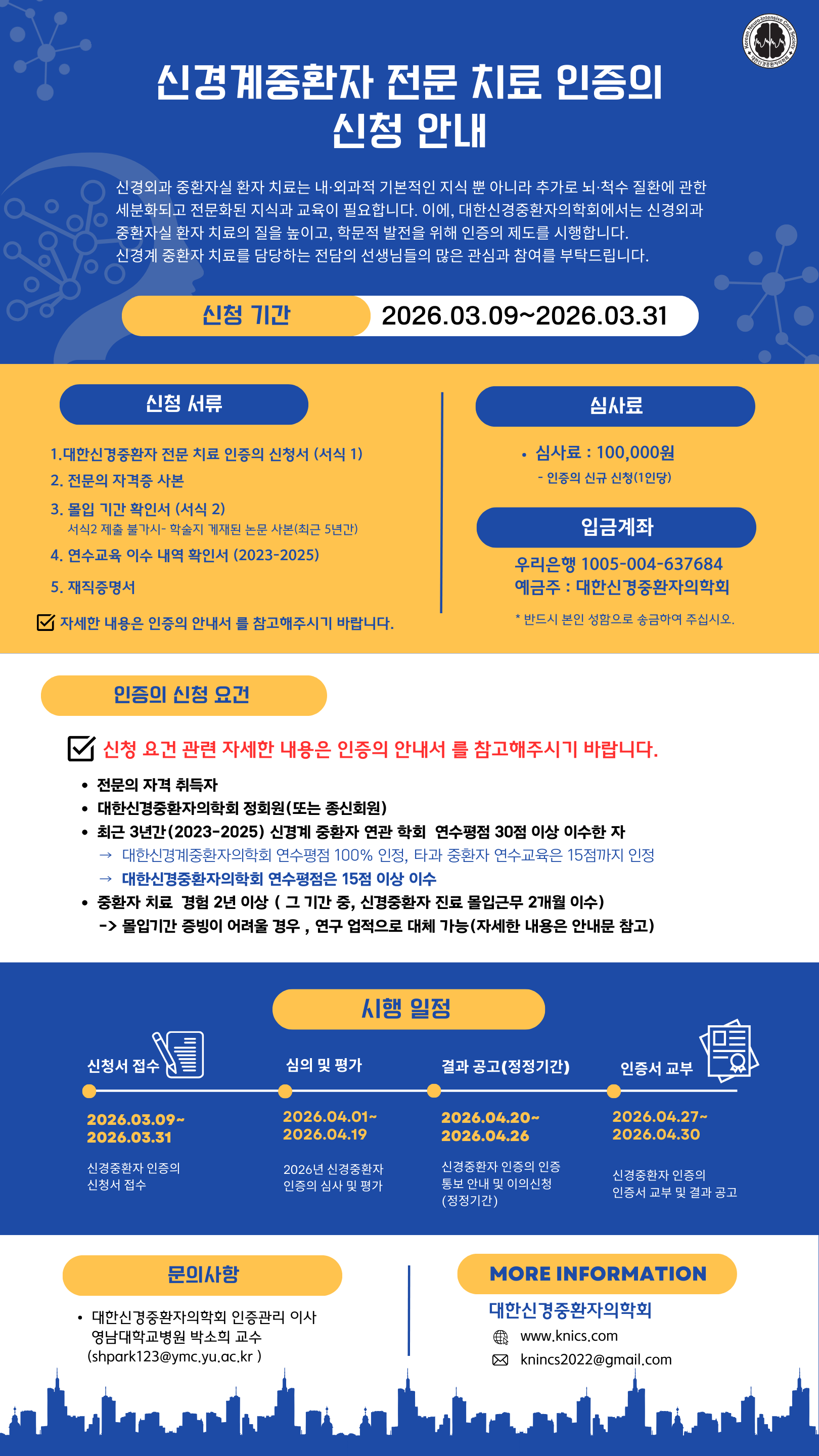 | [중요] 2026년도 "신경계중환자 전문 치료 인증의" 신청 안내 By 사무국 / 2026-03-06 PM 12:39 / 조회 : 22회 |